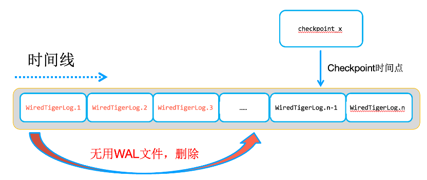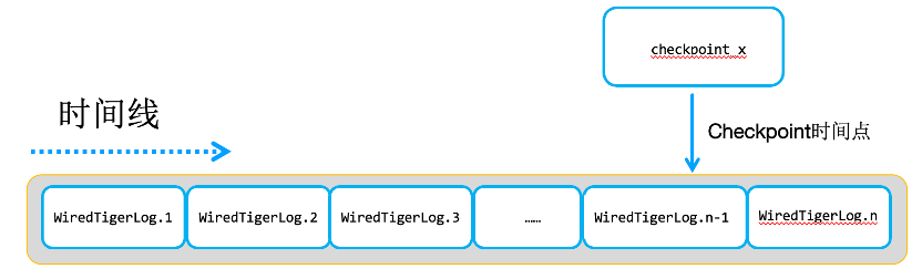 增量数据可以通过 checkpoint 时间点对应的 WAL 文件回放来完成,也就是图中的 WiredTigerLog.n-1 和 WiredTigerLog.n。