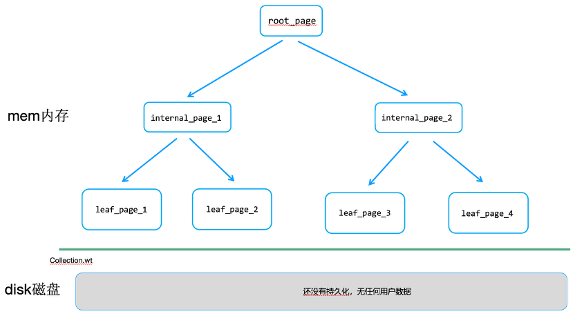 如上图所示,假设当前用户写入数据量不大,并且没有触发 evict,那么所有用户 page 数据都在内存中。当做 checkpoint 的时候,checkpoint 线程会遍历整个 b+ tree 中的可见 page,由于之前这棵 tree 中的所有 page 都没有持久化过,因此对 checkpoint 线程来说这些 page 都是脏 page。持久化到磁盘后的状态大体如下: