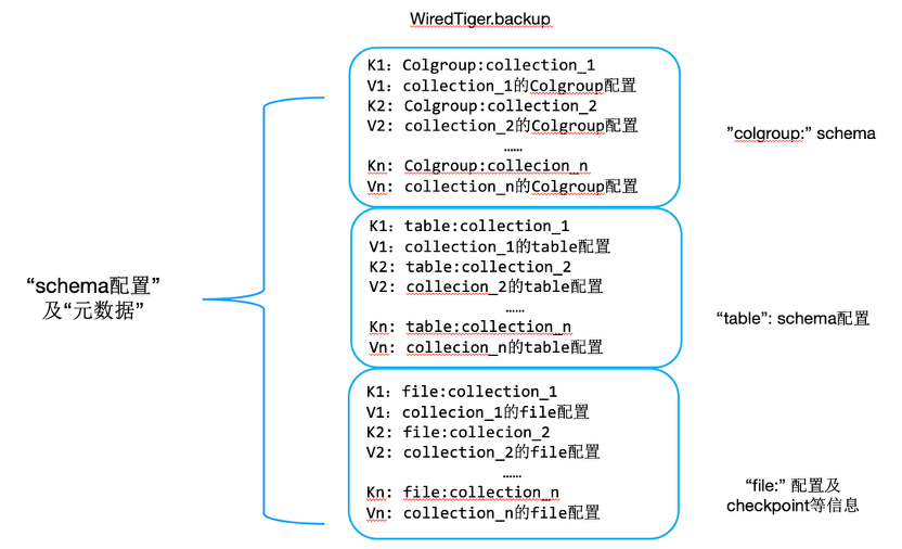 List 是指针结构,指向的内容为数组,数组的每一个 elem 代表一个需要拷贝的 wt 文件。然后获取这些 wt 文件的元数据配置信息存入"WiredTiger.backup.tmp"文件中,当所有的 wt 文件 schemap 配置及元数据写入 tmp 文件完成后,会 rename 更名为“WiredTiger.backup,最终“WiredTiger.backup”内容大体如下: