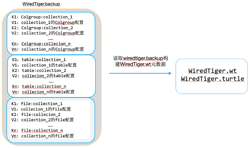 数据恢复实现主要是读取 WiredTiger.backup 内容,然后根据这些内容生成 WiredTiger.wt 元数据文件,元数据文件生成完毕后就可以开始正式数据加载,mongod 即可通过 WiredTiger.wt 元数据文件获取每个表的配置信息,从而完成 wt 加载启动工作。