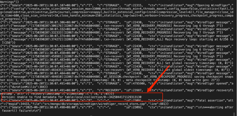 由于 wiredTiger 引擎侧我们通过 exclude_target 删除了 oplog.rs 表对应的 wt 文件,但是 mongo server 侧在_mdb_catalog.wt 和 sizeStorer.wt 两个文件中维护着表、索引、数据量相关元数据。Mongod 启动的时候会加载这两个 wt 文件获取到对应的表,然后去检查这些表是否存在。由于 wiredTiger 引擎侧删除了 oplog.rs 对应的 wt 文件,因此 mongo server 侧检查不通过。