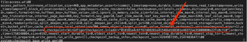 通过 checkpoint 时间点的快照,通过 WiredTiger.wt 元数据文件中的 checkpoint=(WiredTigerCheckpoint.1=(addr="018181e4c6ff67d88281e41546bd168381e48372ae35808080e22fc0cfc0")即可获取 checkpoint 开始时间点的全量数据。