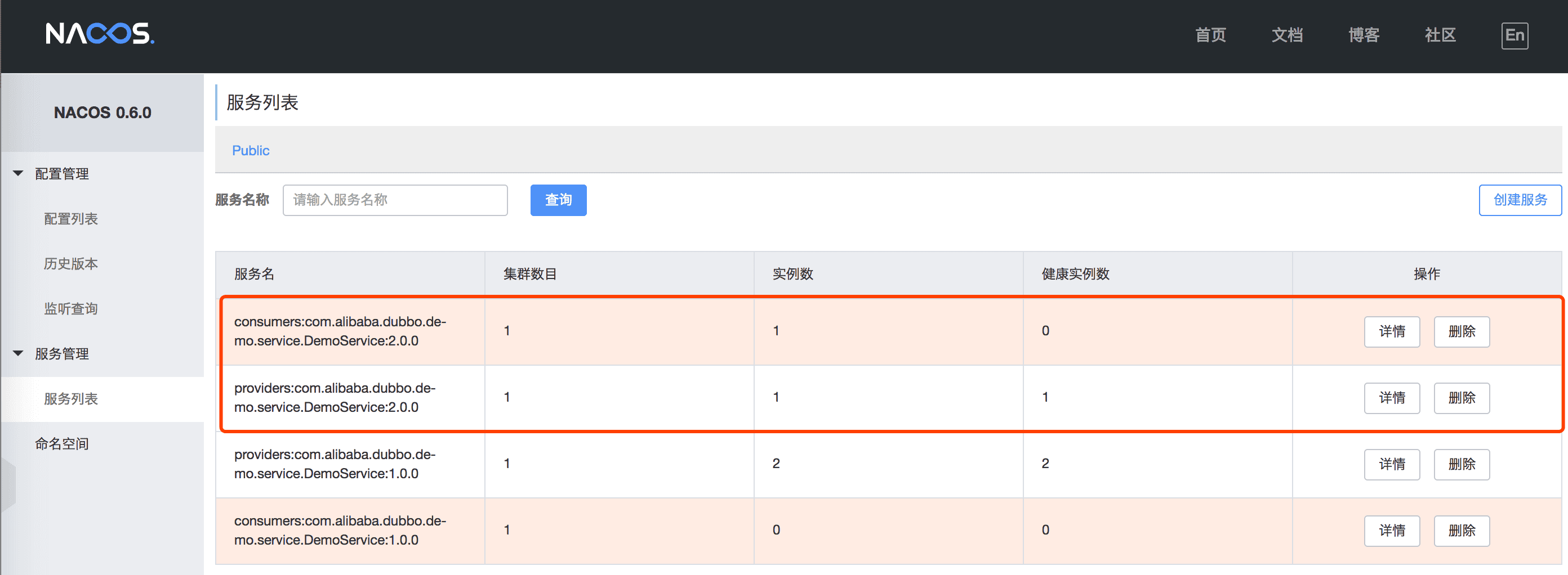 重启 Dubbo 应用后,您同样也能发现服务提供方和消费方的注册元信息呈现在 Nacos 控制台中: