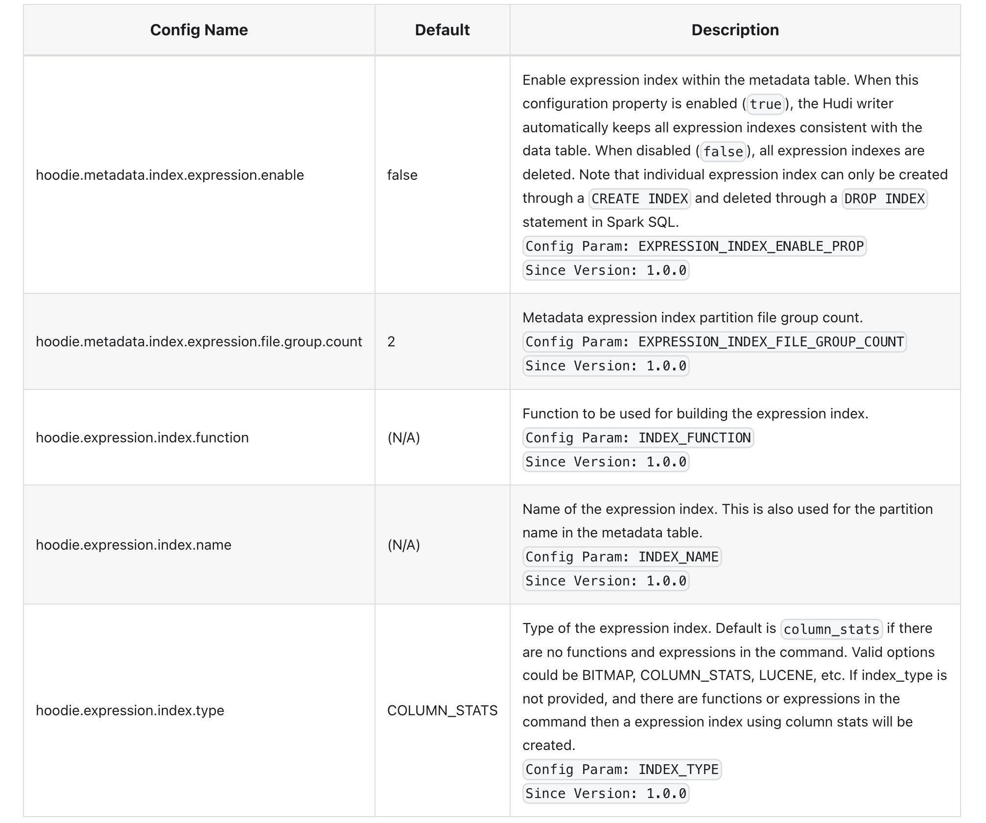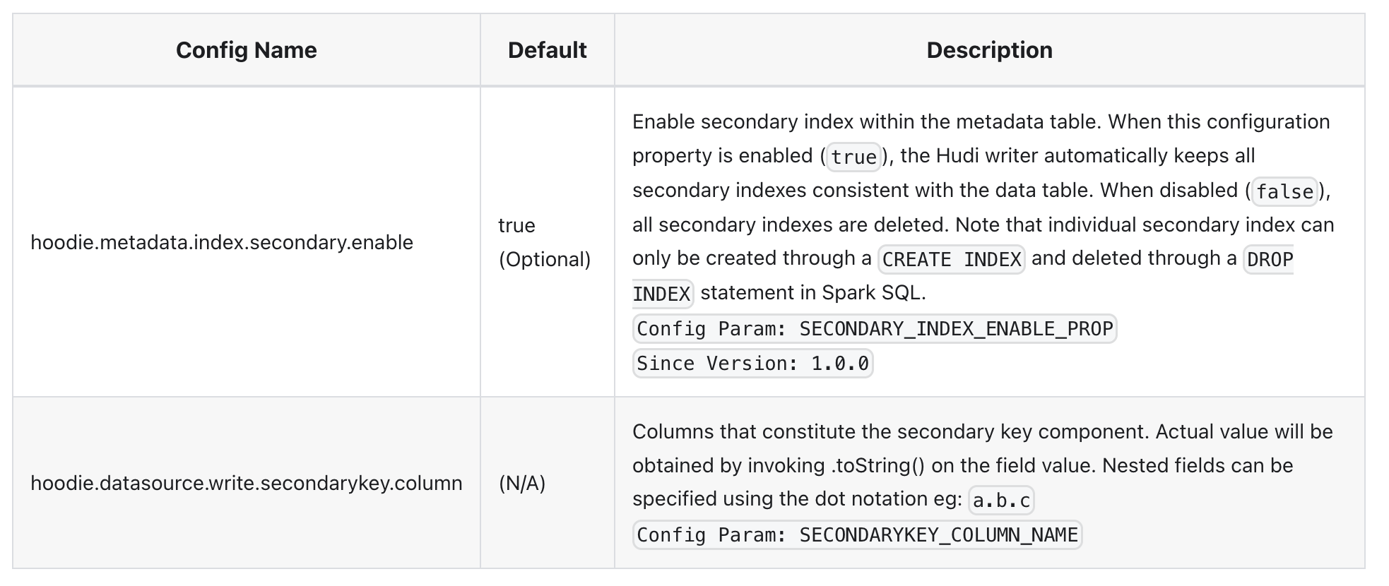 以下是控制在写入器上启用二级索引构建和维护的配置,后续会详细讲解,这个是 1.0 的新增的特性