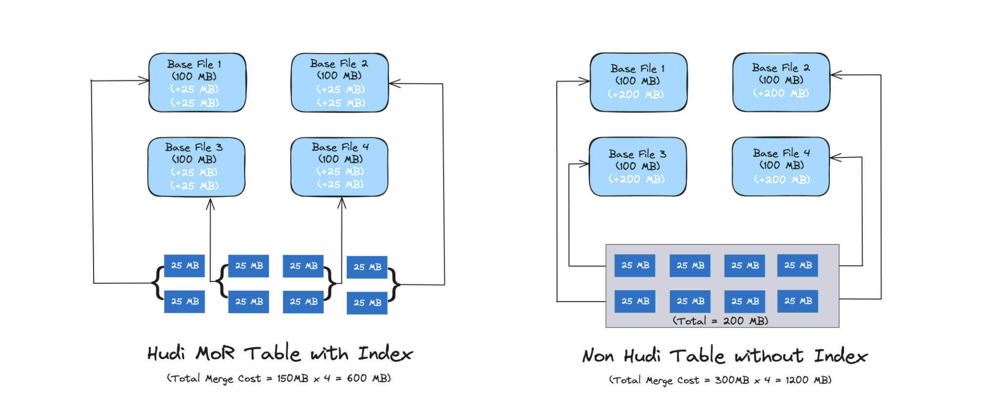 对于 Copy-On-Write 表,索引可实现快速的插入/删除操作,因为无需与整个数据集连接来确定要重写哪些文件。对于 Merge-On-Read 表,索引允许 Hudi 限制需要合并任何给定基础文件的更改记录数量。具体而言,给定基础文件仅需与属于该基础文件的记录的更新合并。相反,没有索引组件的 Hive ACID 需要将所有的基本文件与所有传入的更新/删除记录合并。