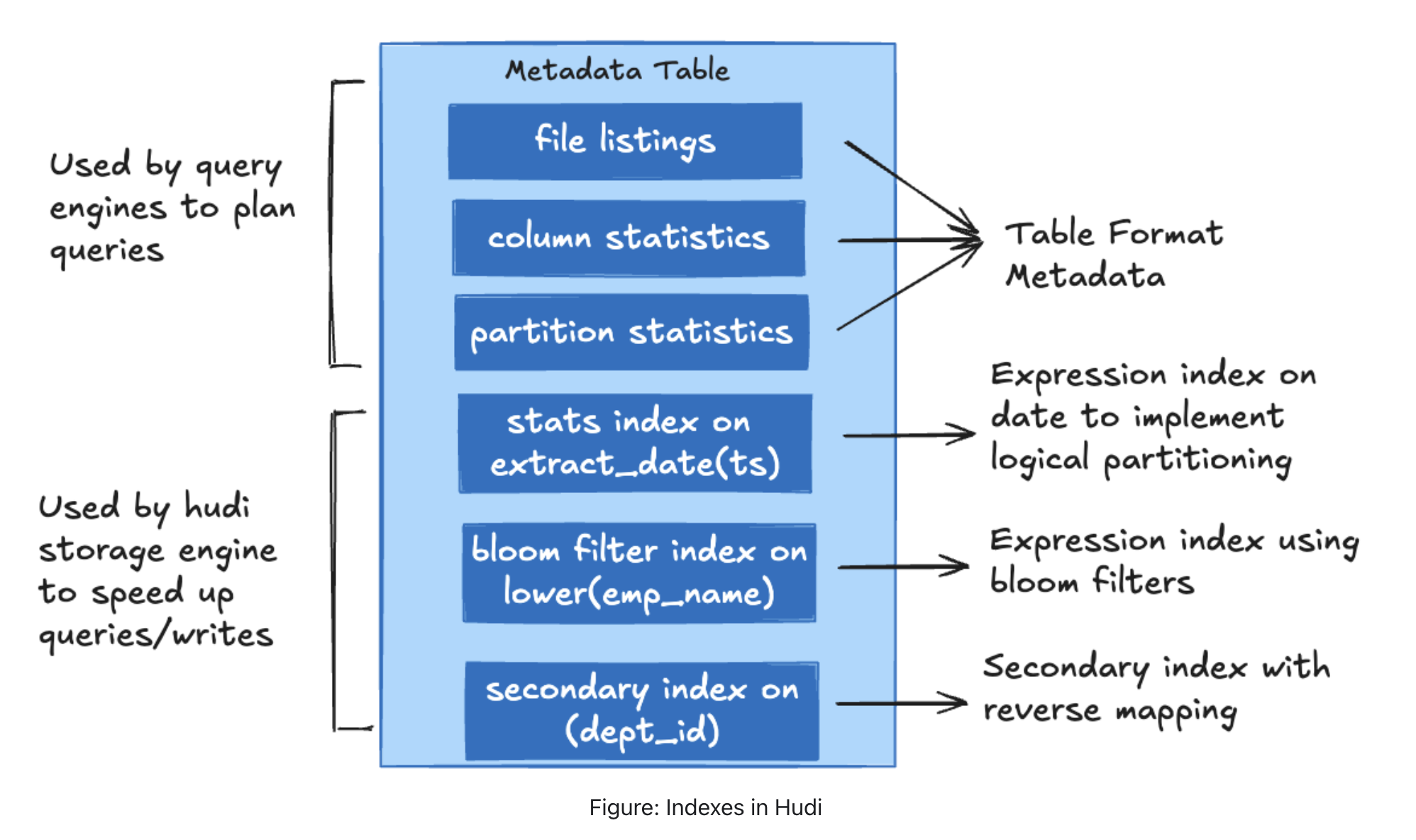 Hudi 通过增强元数据表以合并新类型索引的能力来支持多模式索引,并辅以索引构建的异步机制。此增强功能支持元数据表中的一系列索引,从而显著提高了写入和读取表的效率。