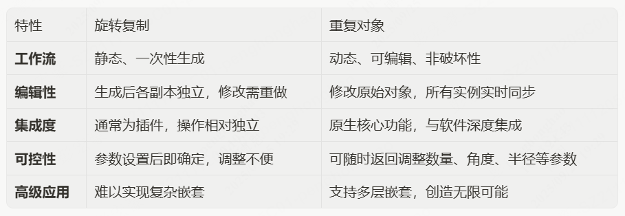 “旋转复制”更像是一个执行命令的工具。你设定好参数,它为你生成一圈静态的副本。这些副本一旦生成,就与原始对象脱离了关系。如果你对结果不满意,想要调整圆形的数量或是大小,唯一的办法就是删除所有副本,从头再来,这是一种破坏性的、线性的工作方式。
