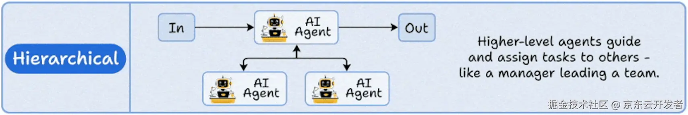 一个顶级规划智能体,将子任务分配给工作智能体,跟踪它们的进度,并做出最终决策。这和经理及其团队的工作方式完全一样(很多中间件的架构也是类似这种模式如 Redis、ES、Nocas)。意图识别就是采用此模式。