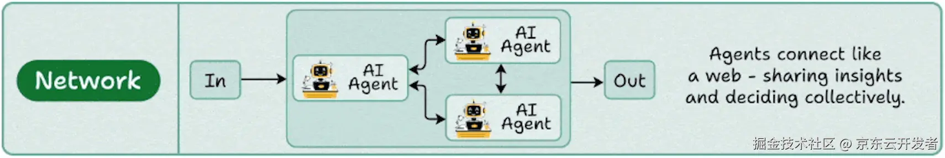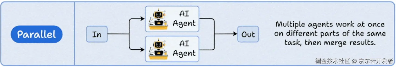 每个智能体负责处理不同的子任务,例如数据爬虫、网络检索和摘要生成,它们的输出会合并为一个单一结果。非常适合减少高吞吐量管道中的延迟。(如文档解析或 API 编排)