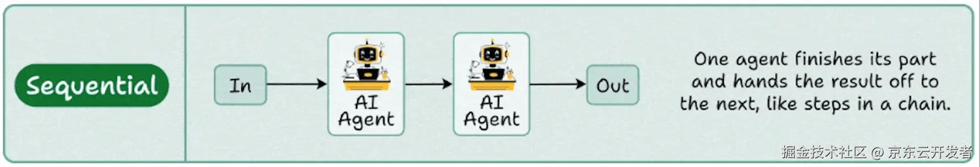 在《Agentic Design Patterns》中叫 Prompt Chaining,每个智能体都逐步地完成输出,比如一个生成代码,另一个审核代码,第三个部署代码。每一步的输出作为下一步的输入。这种信息传递建立了依赖链,前序操作的上下文和结果会引导后续处理,使 LLM 能够在前一步基础上不断完善理解,逐步逼近目标解。