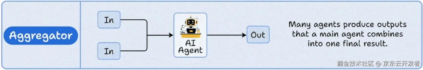 许多智能体生成部分结果,由主智能体将这些结果整合为一个最终输出。因此,每个智能体都形成一个观点,而一个 Master 智能体将这些观点汇总成共识。在 RAG 的检索融合、投票系统等场景中很常见。