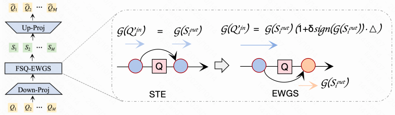 2.EWGS 梯度优化:FSQ 采用的 STE 方法未考虑量化误差。UniDex 构建 FSQ-EWGS 对量化梯度的回传过程进行优化,提高量化网络训练的稳定性和准确性。