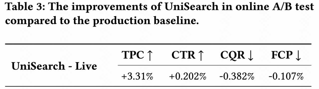 将 UniSearch 部署至在线直播搜索链路后,多项指标取得了显著收益。其中直播进间次数 +3.31% 为近两年来的最高提升。直播搜索的换 Query 率 -0.382% 也取得了明显降低,标志了直播搜索质量的有效提升。