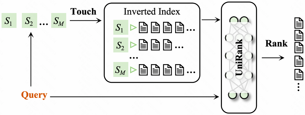 业界倒排系统通常由两个核心模块组成:召回(Touch)模块和排序(Rank)模块。Touch 模块基于倒排索引进行 Term 级检索获取候选集,Rank 模块计算 Query-候选集打分。传统倒排召回包含多路人工 Touch 方法(同义词扩展、Term 省略、实体归一等),以及数十种策略/模型特征等启发式规则的 Rank 方法。UniDex 通过提出 UniTouch 和 UniRank,分别统一了传统倒排的 Touch 和 Rank 模块,避免了繁复的人工设计。在保障相关性和长尾需求的情况下,大幅节省链路资源消耗,为搜索体验带来增益。