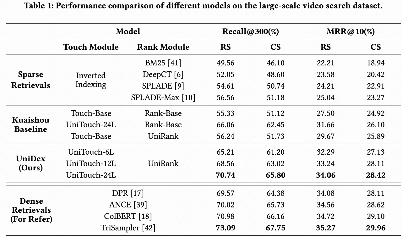 UniDex 在 RS 数据集上,Recall@300 较基线 Sparse 模型提升 14.18%,MRR@10 提升 10.02%,突破传统稀疏化检索依赖 Term 匹配的局限,同时可规避 ANN 检索复杂度高、资源需求大、对检索规模敏感的缺陷。
