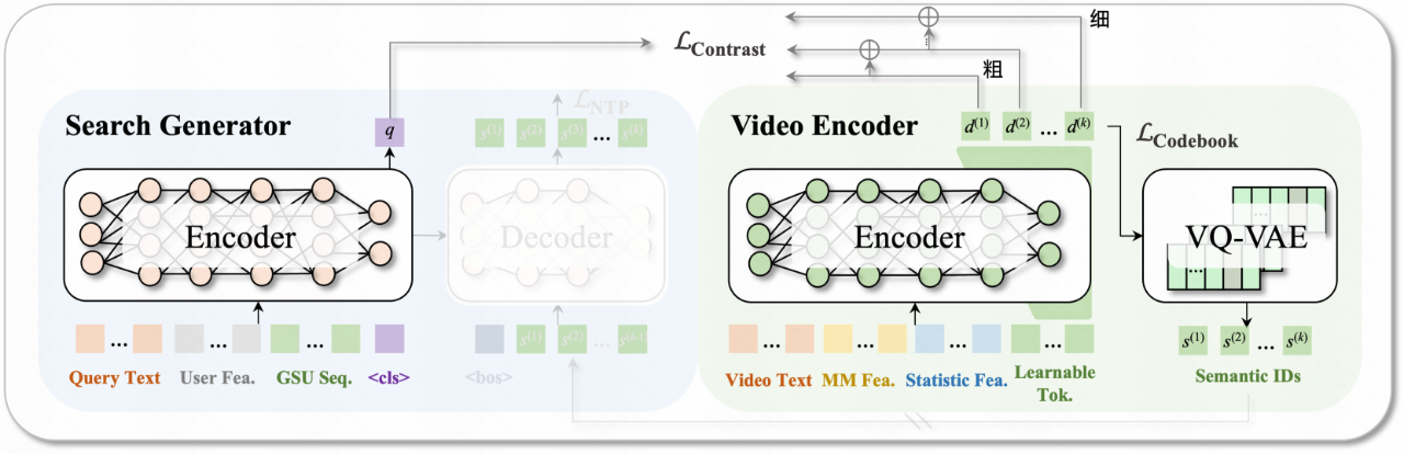Video Encoder,为每个视频学习潜在 embedding 表示和语义 ID。Encoder 的输入为视频侧特征,输出为 Learnable Token 对应的语义序列表征。同时 Video Encoder 有一个用于离散化的 VQ Codebook,用于将连续的 Embedding 转化为语义 ID。