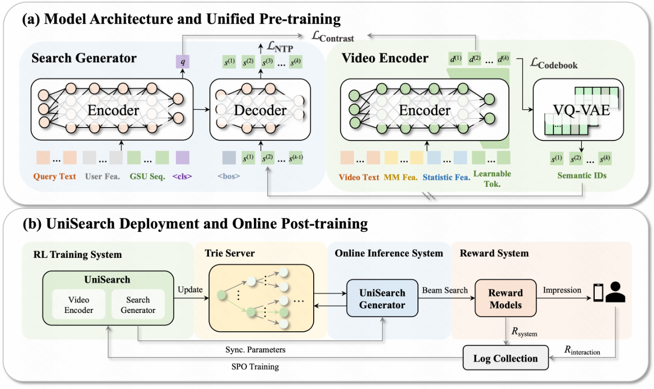 先前的生成式搜推模型(如 OneRec)采用两阶段训练,item 离散化表示和 item 生成任务,这会导致两阶段目标不一致。为此,设计了“真端到端”的训练架构 UniSearch,将 Search Generator 和 Video Encoder 统一到一个训练框架。