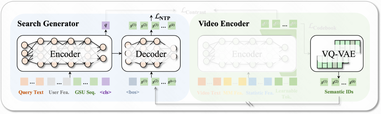 Search Generator 采用 “Encoder-Decoder” 架构,输入为搜索词、用户特征序列等。使用 <cls> 来表征 query 侧整体语义向量。Decoder 侧自回归地预测出视频的语义 ID。