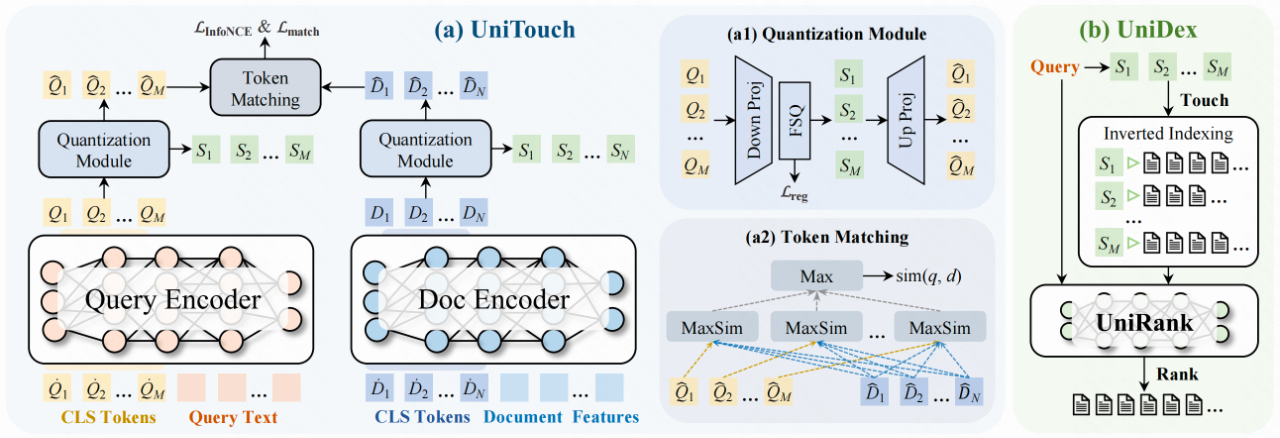 UniRank 采用与 UniTouch 相似的双塔架构设计。二者的核心差异在于:UniRank 以提升语义匹配准确度为核心目标,将 Query 与视频的语义信息分别编码为多个 128 维稠密向量(Dense Vector),并执行 Token-level 细粒度交互。
