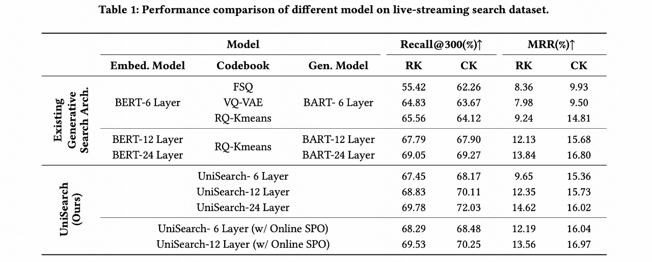 UniSearch 在离线评估中始终优于各项基线方法。在相同模型规模下,UniSearch-6 Layer 在 MRR 指标上超越其他 6 层基线,并在 Recall@300 上达到了接近 12 层基线的性能。这表明统一的训练目标不仅提升了生成结果的相关性,也显著改善了整体生成质量。