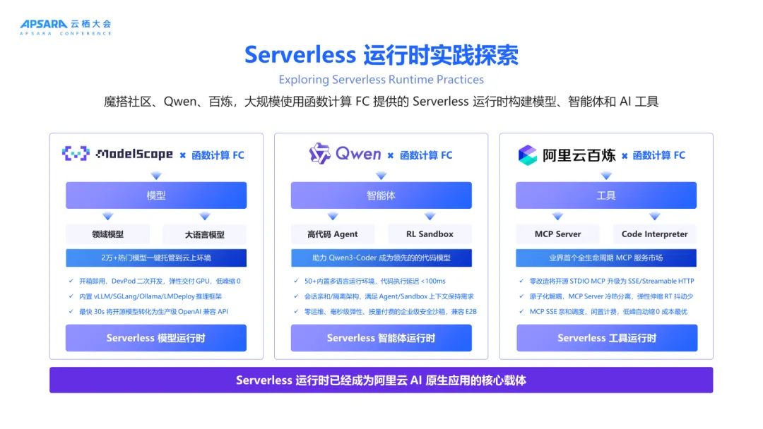 这三大运行时均基于函数计算构建,为开发者提供 0 运维、极致弹性、成本最优的 AI 原生基础设施,并联动阿里云、通义实验室、魔搭社区等生态,全面加速 AI 应用创新。