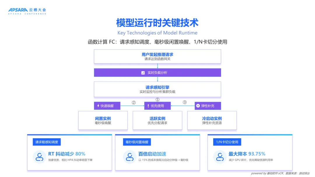 支持超 20,000 + 热门开源模型一键部署为生产级 API。通过异构算力池、请求感知调度、毫秒级闲置唤醒、1/N 卡切分技术实现实时/准实时推理场景冷启动加速,实现 RT 抖动减少 80%,最高降本 93.75%。