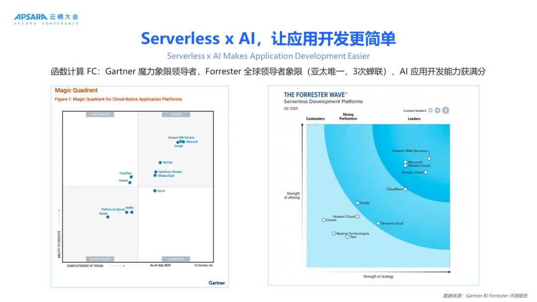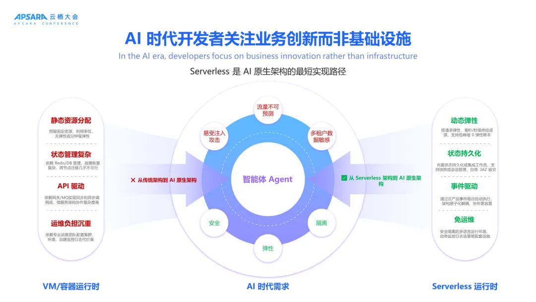 Serverless 架构因其动态弹性、免运维特性,成为 AI 原生架构的最短路径。开发者可专注于业务创新,无需关注基础设施细节。