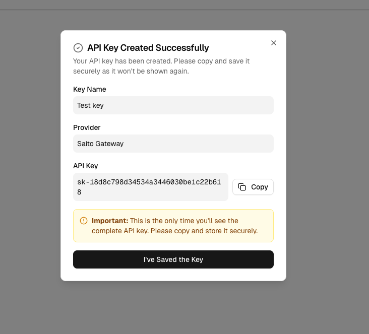 创建完成后,点击 Copy(复制) 保存你的 API Key 此时你可以在列表页看见你已经创建的 key