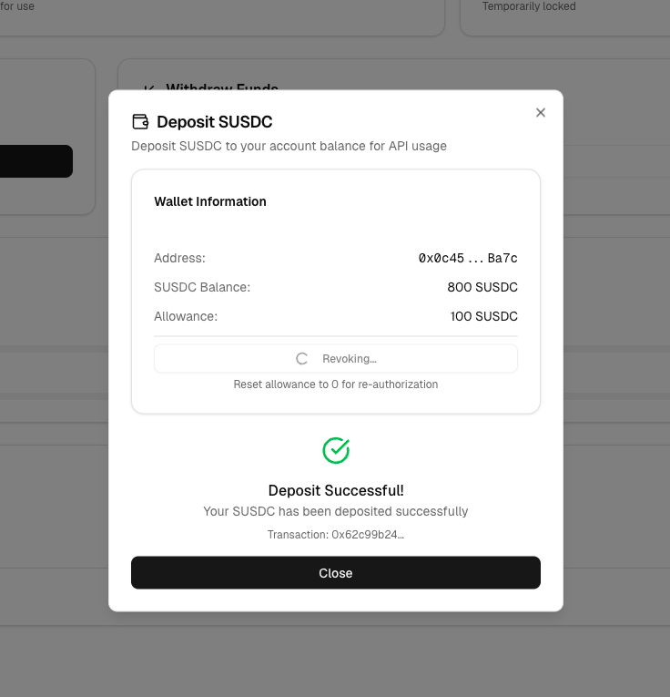 在 MetaMask 中批准交易(授权+deposit),等待约 1 分钟,会提示交易完成,deposit 成功