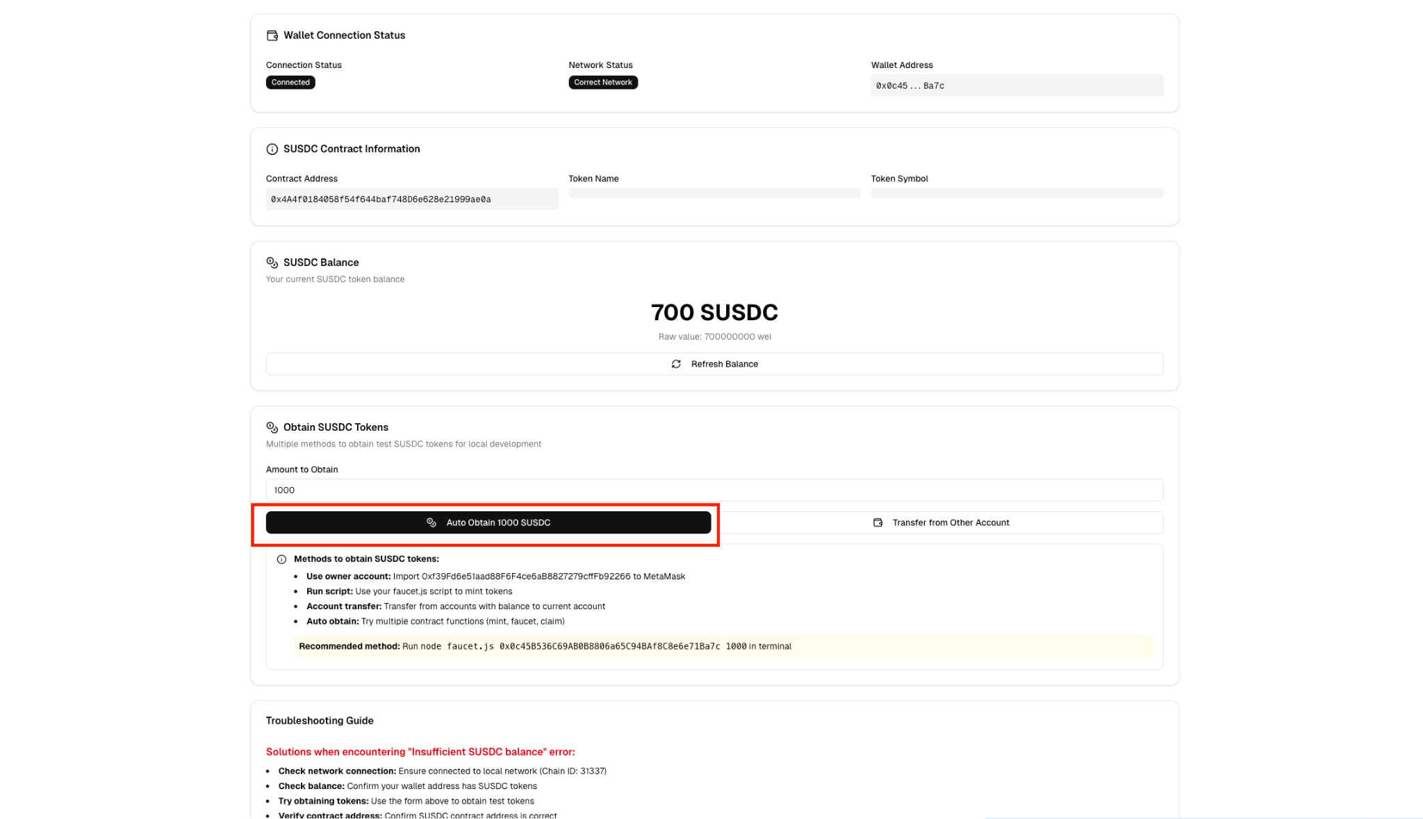 点击 “Auto Obtain 1000 USDC”(铸造 1000 USDC)