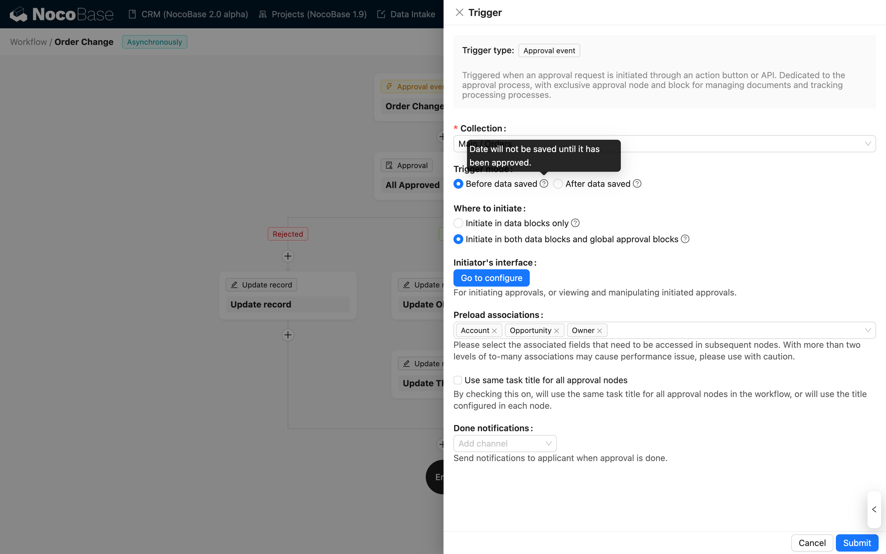 审批现在支持“数据保存前”触发模式——启用后,审批发起时不会存储数据,只有在审批通过后才会保存数据。