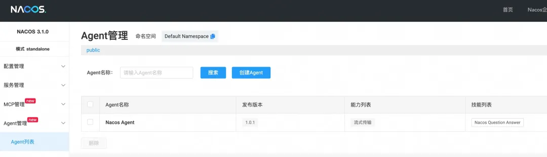 Nacos 3.1.0 首次引入 A2A 注册中心功能,为 AI Agent 框架(如 Spring AI Alibaba)及开发者提供轻量化的 Agent 服务注册与发现能力。