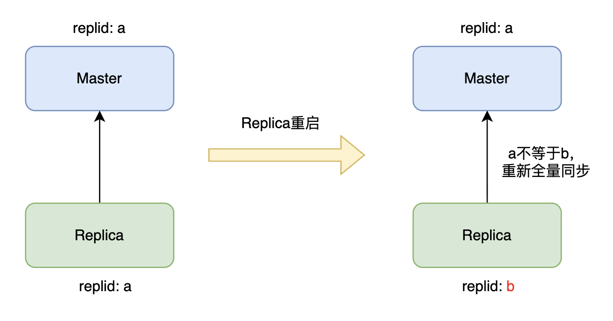 如上图所示,从节点重启后,replid a 丢失,生成了一个新的 replid b,与主节点不一致,从而只能全量同步,尽管与主节点只有少部分数据不一致。