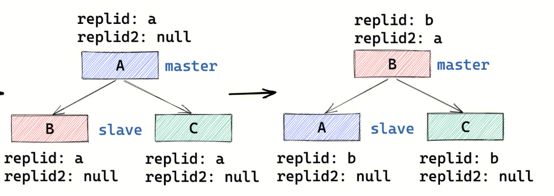 PSYNC2 下主从复制 replid 的变更流程详见下图。节点 B 在提主后将 A 的 id 记录在 replid2 中。申请同步时,A、C 的 replid a 与 B 的 replid2 a 一致,因此能进行增量同步。同步后 A、C 的 replid 变更为新主的 b。
