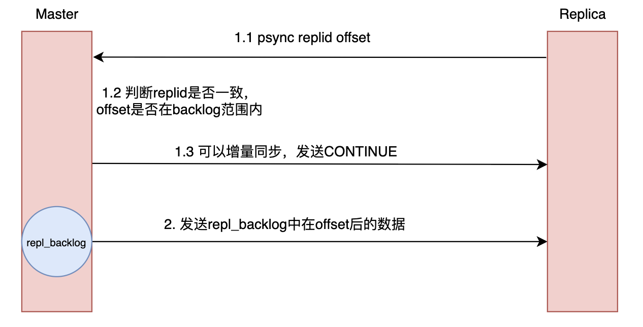 在介绍增量同步的具体实现前,我们先来讲一下主节点如何判断是否能进行增量同步。判断的依据来源于 replica 发送的 PSYNC 命令中的两个参数:replid 和 offset。