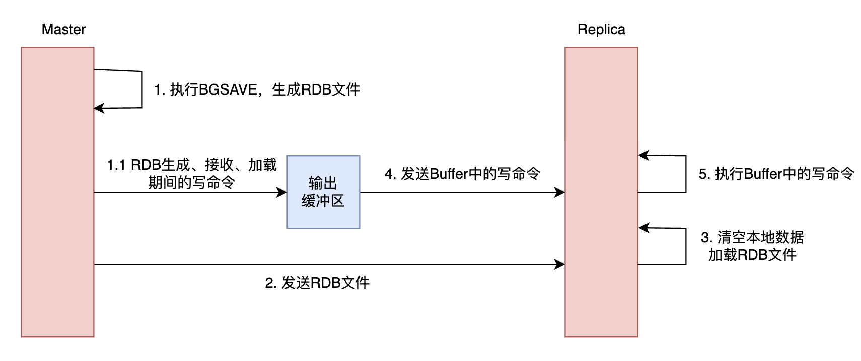 在全量同步过程中,从节点的数据实际上有两个来源:主节点发来的 RDB 快照以及输出缓冲区中的写命令。Redis 需要保证: