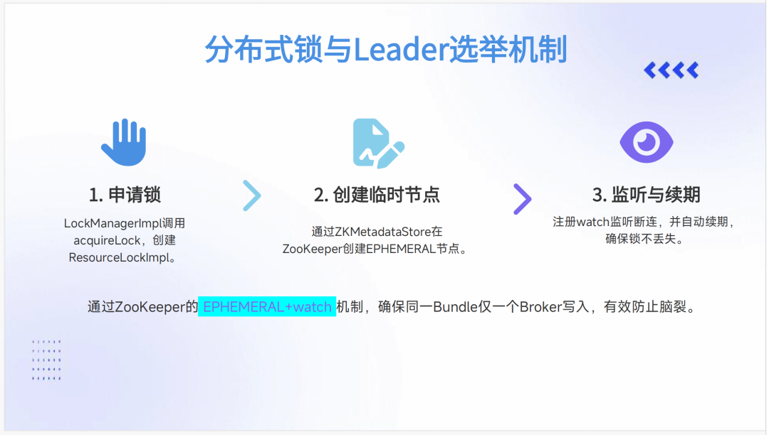 关键保障机制防止脑裂问题。通过 ZKMetadataStore 在 ZooKeeper 创建临时节点,LockManagerImpl 调用 acquireLock 创建 ResourceLockImpl,确保同一 Bundle 仅一个 Broker 可写入。这种互斥保证是消息顺序性和一致性的基础,在金融、交易等场景中尤为重要。