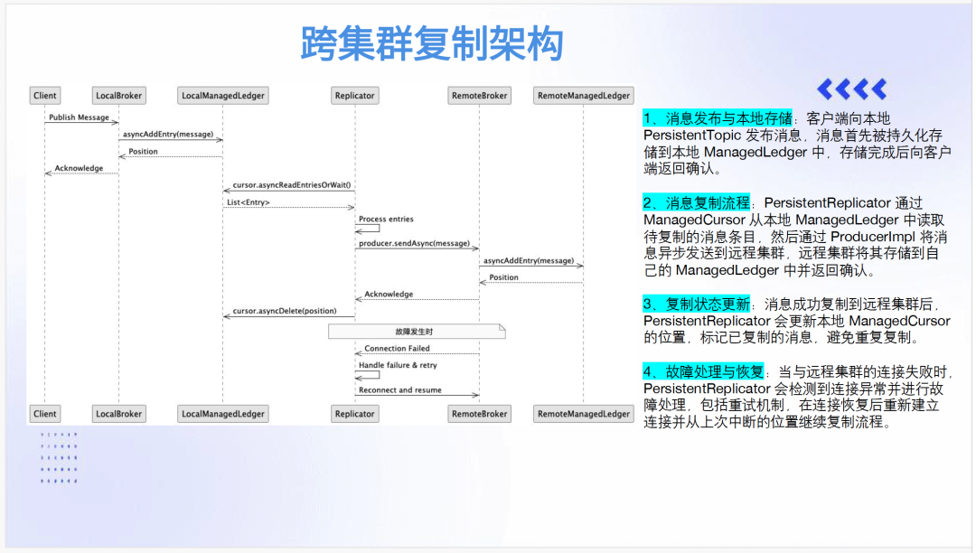 本地存储阶段确保数据安全。客户端消息先持久化到本地 ManagedLedger,返回确认后才触发复制。这种"先持久化,后复制"的语义保证了即使在复制失败的情况下,本地数据仍然是完整的,为手动修复提供了可能。