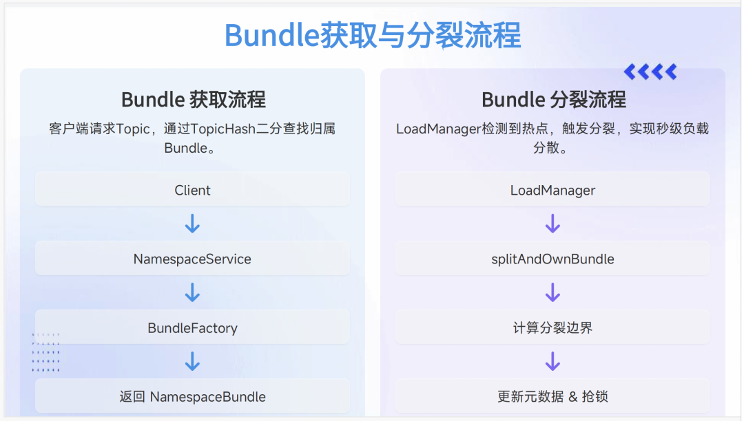 Bundle 分裂流程响应负载变化。当 LoadManager 检测到热点 Bundle(基于内存等指标)时自动触发分裂。系统计算分裂边界并更新元数据,通过抢锁机制获取新 Bundle 所有权,支持多种分裂算法选择。这种自动化热点处理能力大大减轻了运维负担,特别是在流量模式快速变化的互联网业务中。