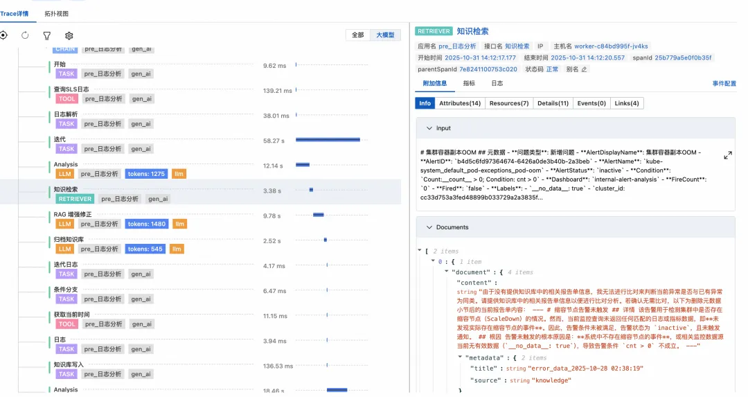 Retriever 节点会采集查询语句、召回片段、关联文档元数据、embbeding 评分等信息。