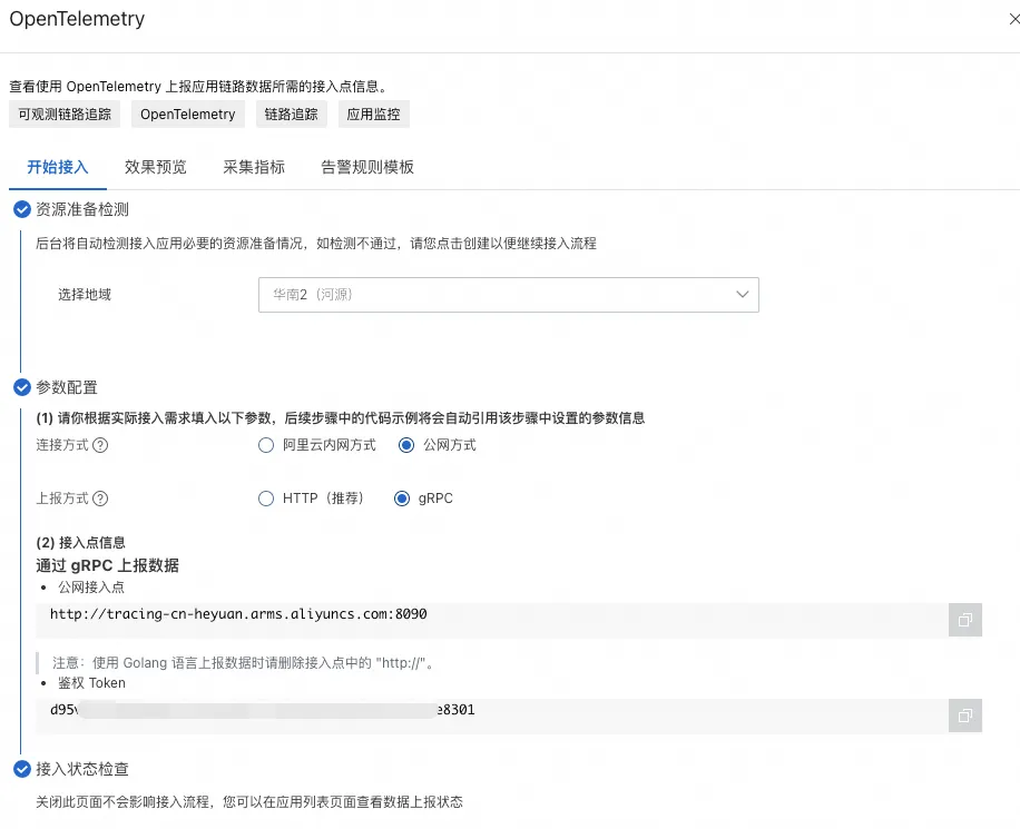 在弹出的 OpenTelemetry 面板中选择数据上报地域,上报方式选 gRPC。