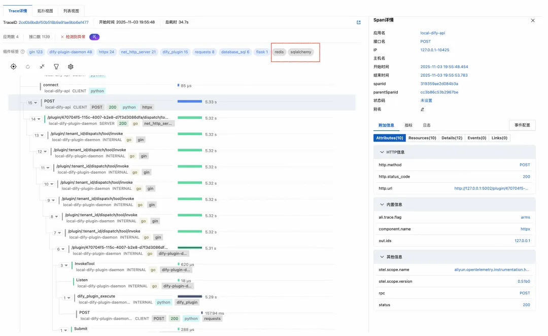 可以看到 dify 执行引擎(local-dify-api)发起了对 dify 插件引擎(local-dify-plugin-daemon)的 POST 调用,插件引擎调用插件运行时(local-dify-plugin-daemon_plugin_cms_0.0.1)并转发请求给 SLS 服务端口。整个链路上耗时最长的是 dify_plugin_execute,这是插件运行时内部的入口方法,我们正是在此处注入了故障模拟的慢调用。