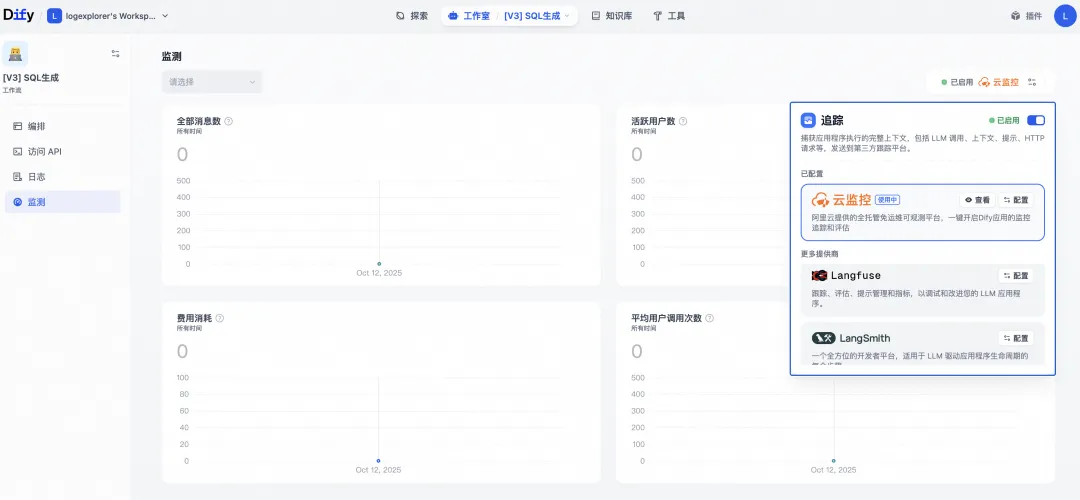 其一是 Dify 内置的应用监控能力,数据采自 Dify 执行引擎运行过程中生成的执行明细记录,存储在 Dify 数据库内。其特点是和 Dify 自身的集成度最高,在开发调试阶段使用非常方便。