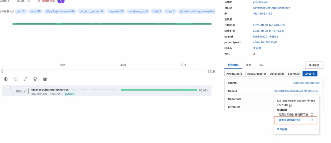 限于 Dify 框架特性,Dify 官方集成的云监控和 Python 探针采集的 Trace 无法直接联通,但可以通过 Trace Link 方式实现大模型应用和微服务应用的相关关联,通过 Python 探针和 Dify 原生监控组合实现 API 组件的可观测。