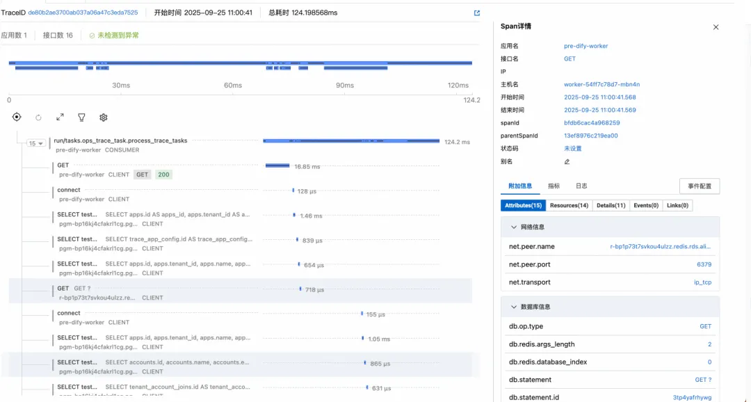 使用最新版 Python 探针即可,Dify v1.x 版本都可用,因为只采 HTTP/Flask/Redis/DB 等框架层数据,所以 Python 探针对 Dify 版本无强要求。Dify v1.8.0 以后的版本支持通过 Trace Link 方式串联 Dify 官方集成上报的 Workflow 执行明细数据。