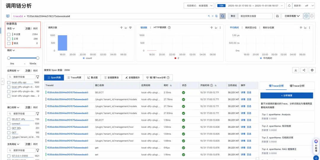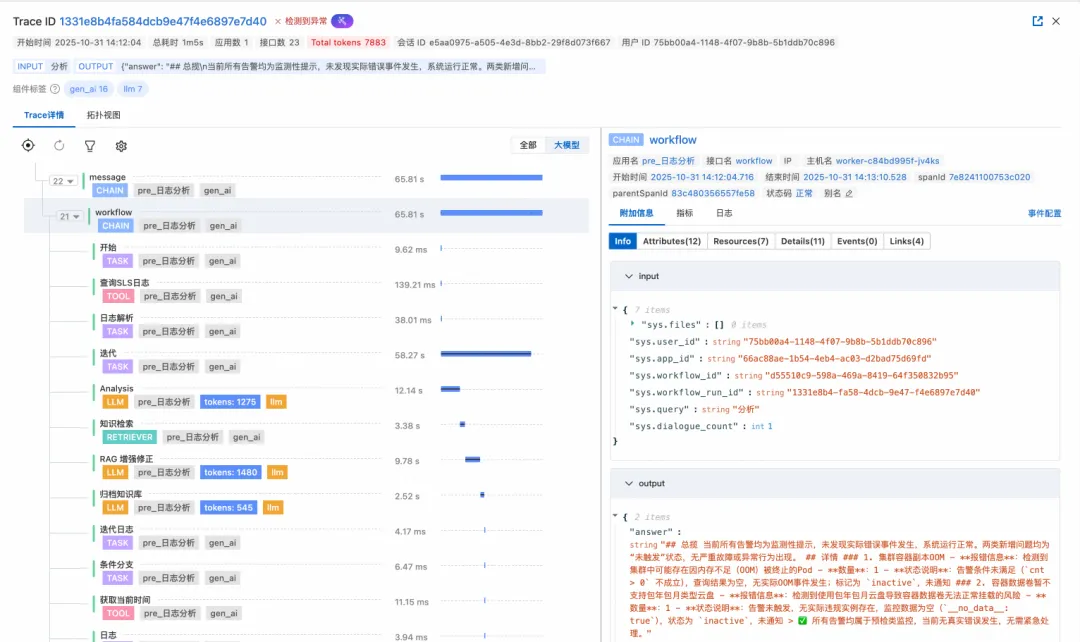 如图示例中“查询 SLS 日志”是一个 Dify 插件,正常调用只需 200 ms,但在这个 Trace 中却有 5s 多的慢调用。仅看 LLM Trace 或 Dify 执行日志,无法判断慢请求是因为 Dify-Api 引擎、Dify-Plugin-Daemon 插件引擎、Dify-Plugin 运行时或者 SLS 日志服务本身导致的。