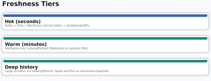 (在生产环境中按数据新鲜度做了分层:Hot(秒级)通过 Kafka → Flink → StarRocks 内部表;Warm(分钟级)由 StarRocks 直接查询 Iceberg/Paimon(联邦查询,必要时配合 MV 加速);Deep history(深度历史)保留在 Iceberg/Paimon 中,由 Spark 以版本化快照方式进行回灌与补齐。)