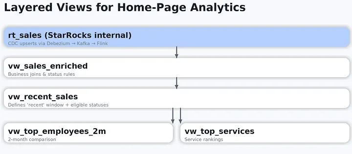 (首页分层视图示例:rt_sales(CDC upsert 写入)→ vw_sales_enriched(业务关联、状态口径、分区过滤条件,以及衍生字段/过滤字段,例如 day、is_eligible、provider_bucket)→ vw_recent_sales → vw_top_*。)