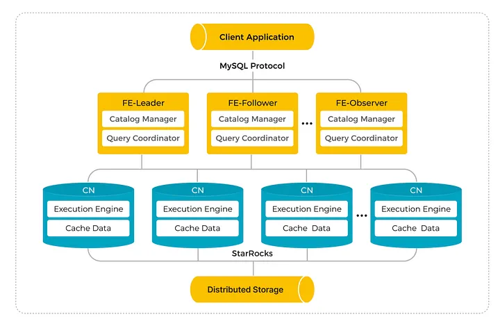 (StarRocks 采用存算分离架构:客户端通过 MySQL 协议连接到 FE 节点(Leader、Follower/Observer),由 FE 负责 Catalog 管理与查询协调;CN 节点承担实际查询执行并进行数据缓存。持久化数据存放在分布式存储中,因此扩展算力时只需要新增 CN 节点,无需对存储数据做重分布。)