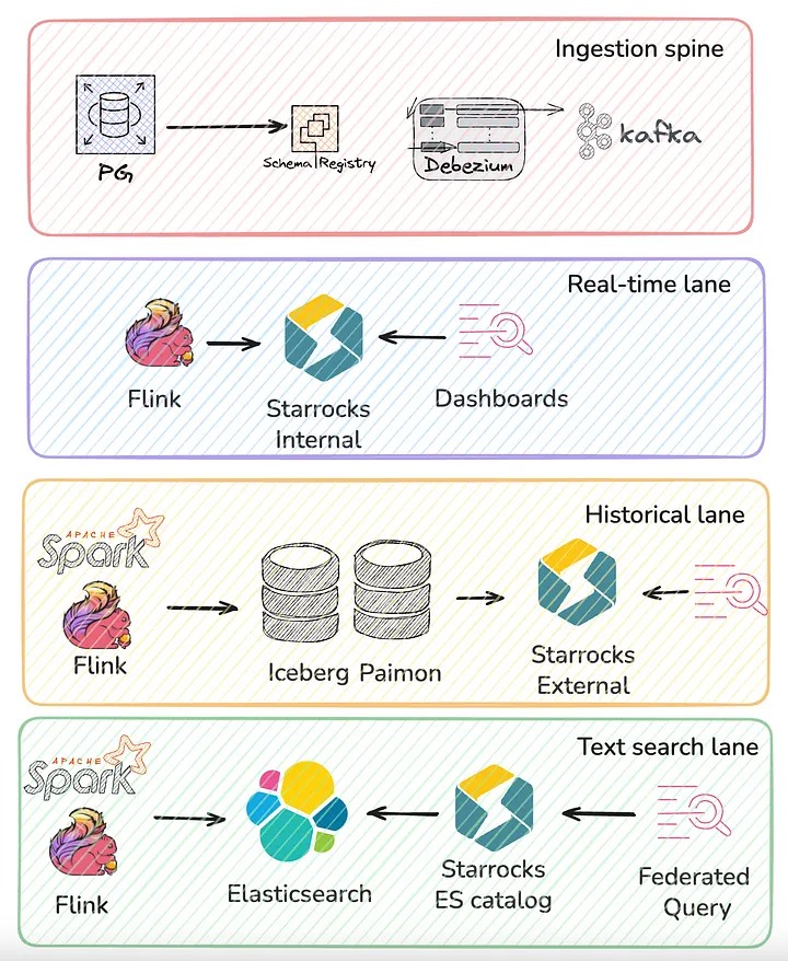 (Fresha 的高层数据流如下:以 Postgres 为主的数据源通过 Debezium + Schema Registry 接入 Kafka;计算层使用 Flink 与 Spark;湖仓层采用 Iceberg + Paimon;下游由多个 Sink 承接,其中 StarRocks 作为统一的 SQL 查询入口。StarRocks 通过外部 Catalog 访问湖仓数据,计算层则分别服务实时与历史链路,对湖仓进行读写。)